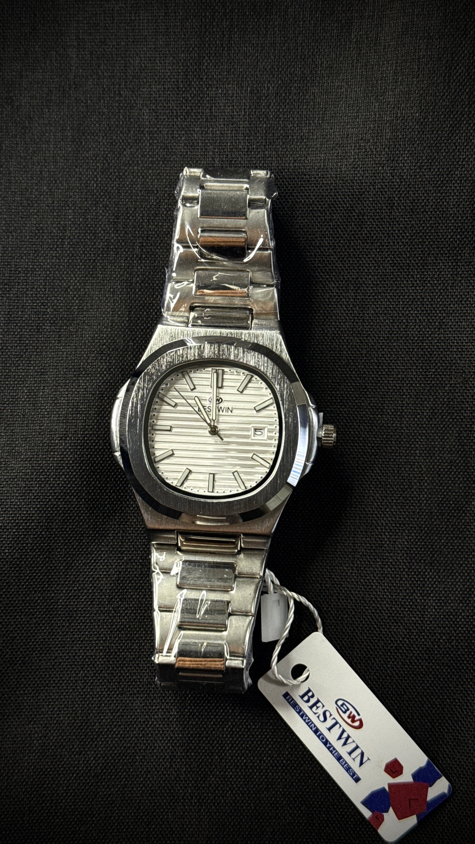 "Introducing the Bestwin Nautilus - a top-quality timepiece blending style and functionality. This watch features a sleek stainless steel construction with a striking white dial and silver hour markers. With Bestwin branding on the face and a sturdy metal band, this replica captures the essence of a luxury design at an accessible point. The watch includes a date display at 3 o'clock, adding practicality to its sophisticated look. Crafted with attention to detail and quality finishing, this Bestwin Nautilus replica is perfect for those seeking a premium feel without compromising on style.