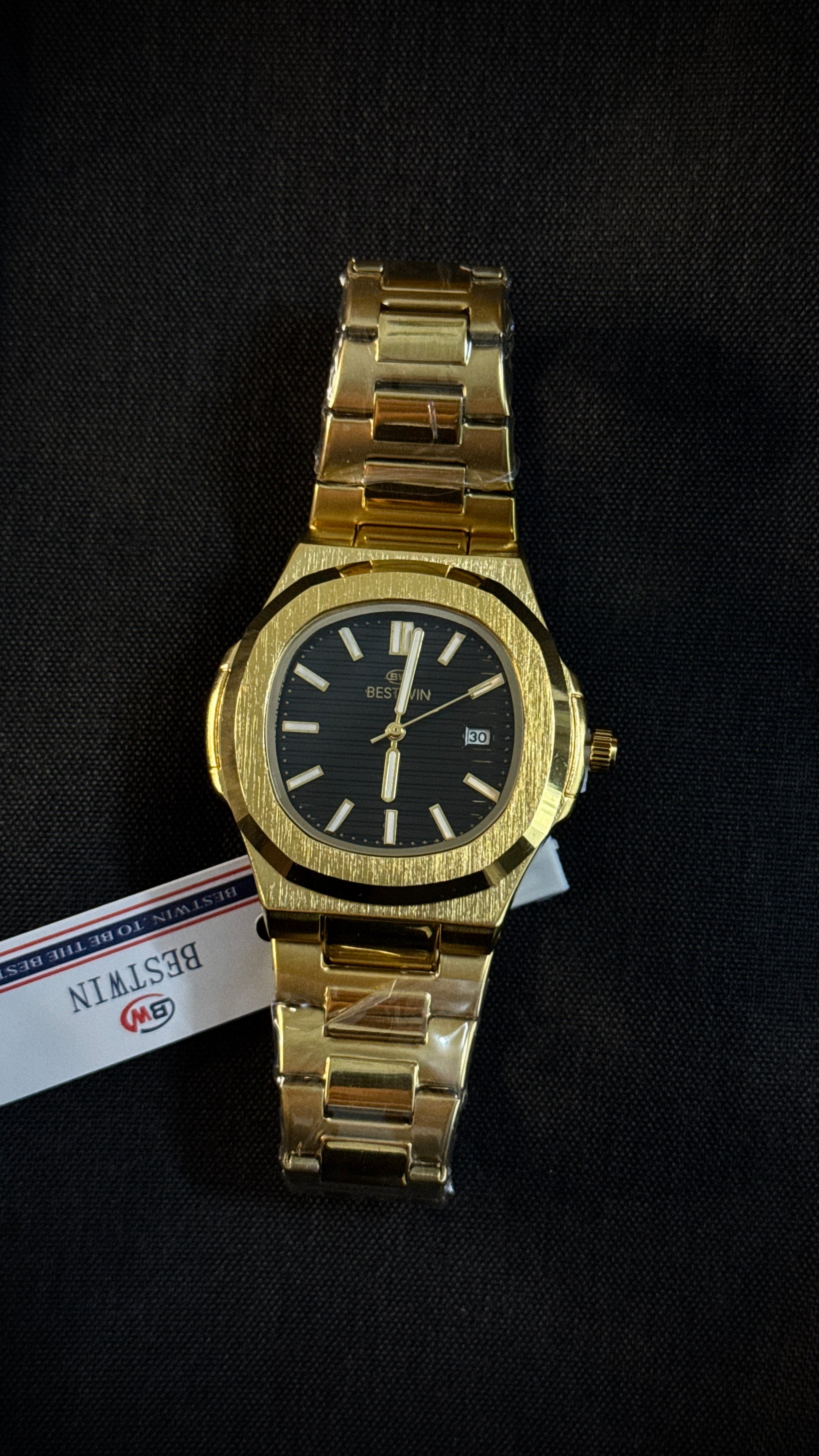 "Introducing the Bestwin Nautilus - a top-quality timepiece blending style and functionality. This watch features a sleek stainless steel construction with a striking golden dial and silver hour markers. With Bestwin branding on the face and a sturdy metal band, this replica captures the essence of a luxury design at an accessible point. The watch includes a date display at 3 o'clock, adding practicality to its sophisticated look. Crafted with attention to detail and quality finishing, this Bestwin Nautilus replica is perfect for those seeking a premium feel without compromising on style.