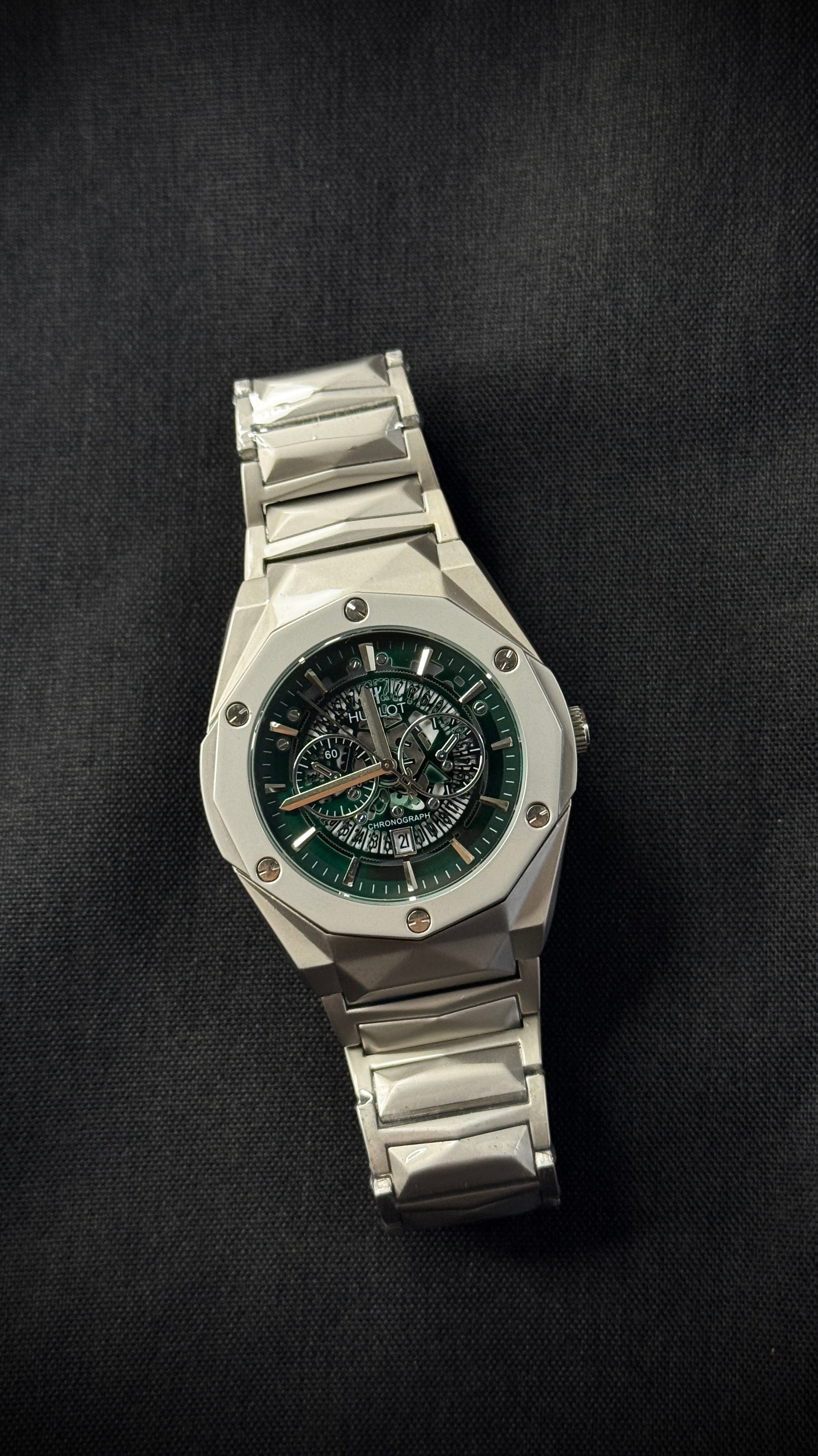 “The watch features a stainless steel case and bracelet with a striking green dial and sub-dials, showcasing a skeletonized design that highlights the mechanical movement. It's set against a black fabric background, emphasizing the watch's details.