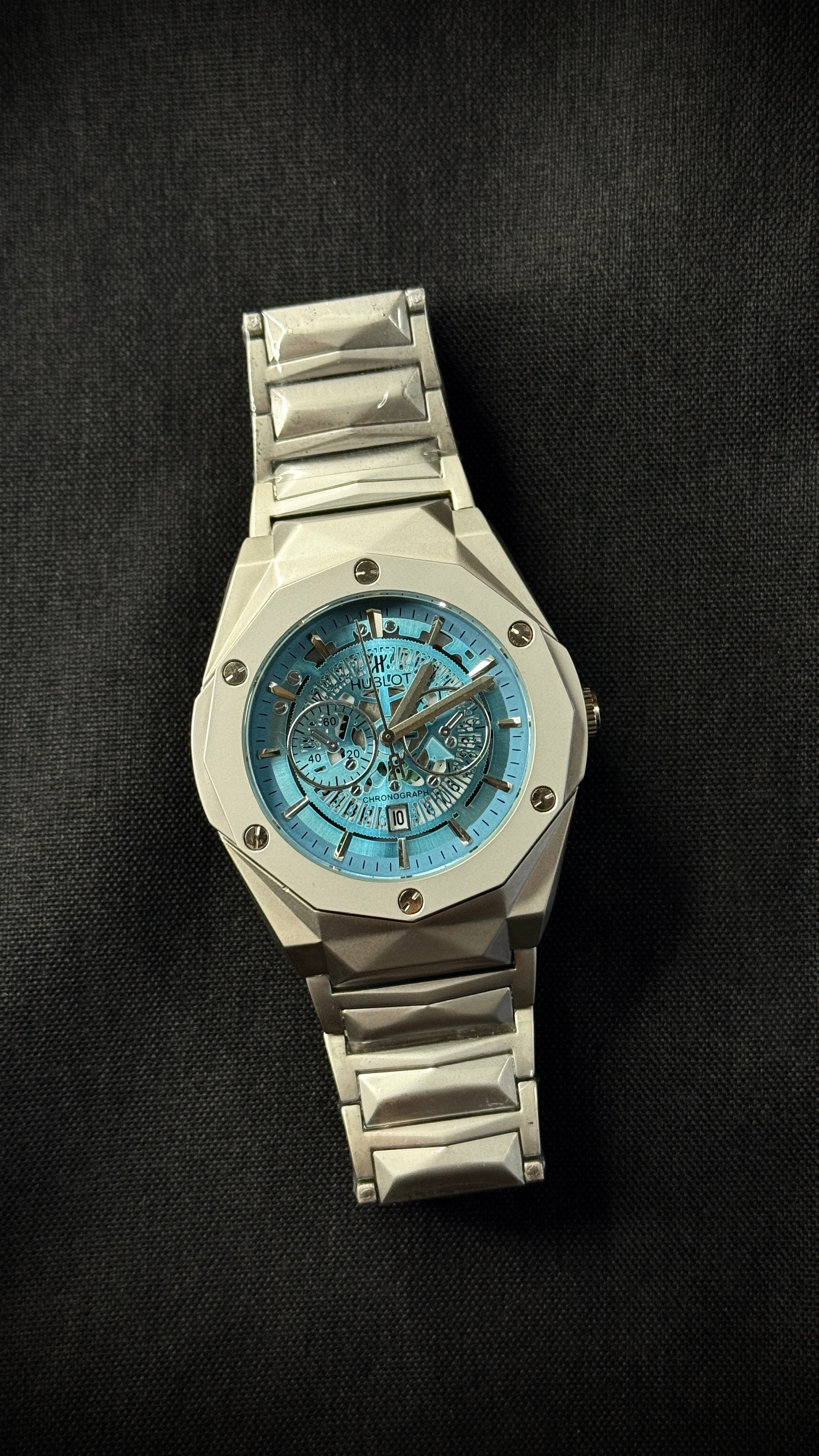 “The watch features a stainless steel case and bracelet with a striking sky blue dial and sub-dials, showcasing a skeletonized design that highlights the mechanical movement. It's set against a black fabric background, emphasizing the watch's details.