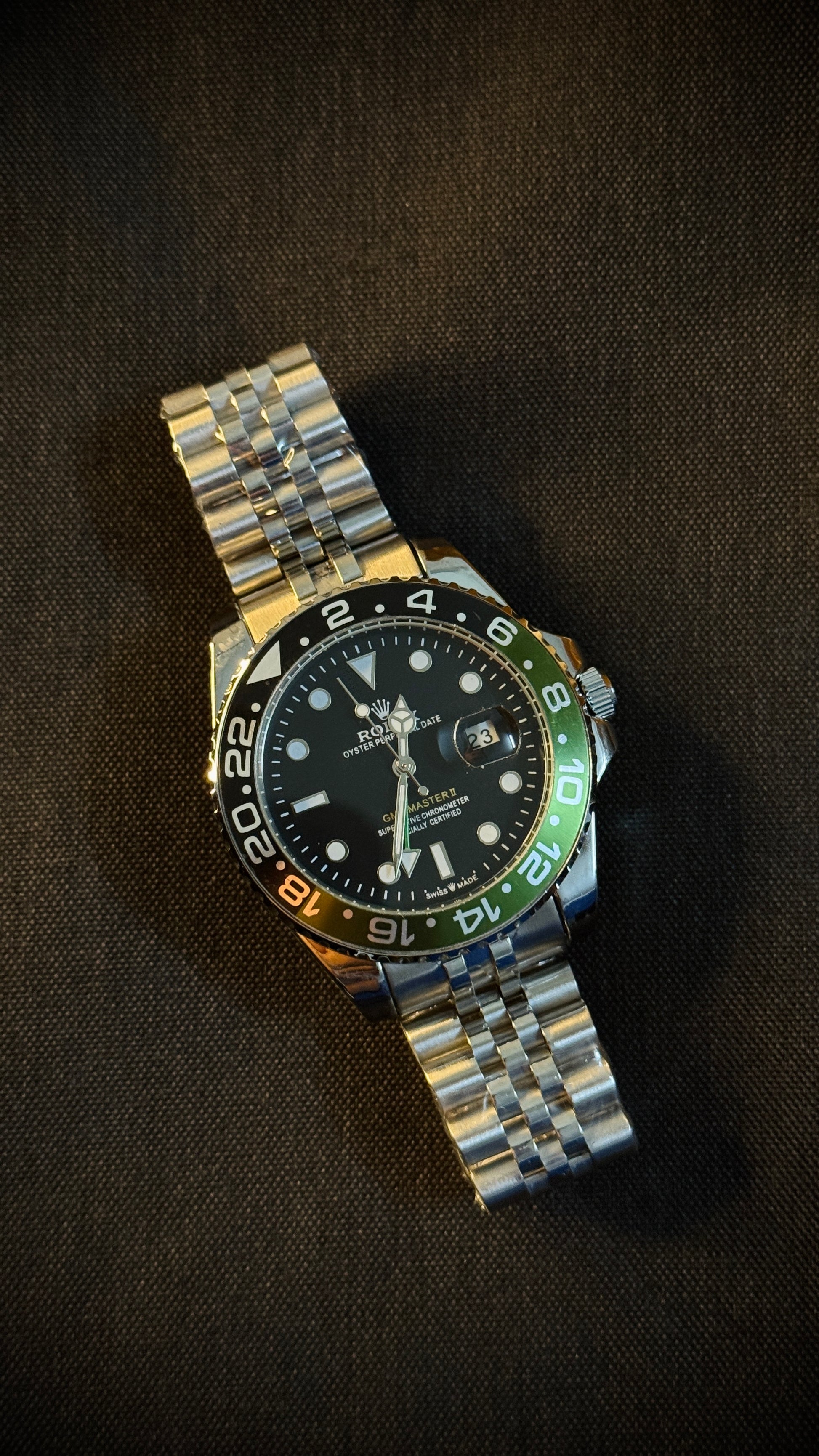 Experience the luxury look with this best-quality GMT-Master II. Featuring a bold green & black ceramic bezel, stainless steel bracelet, luminous markers, and date display, this timepiece delivers premium finishing and durability. Perfect for those who want a stylish statement watch at an affordable price.