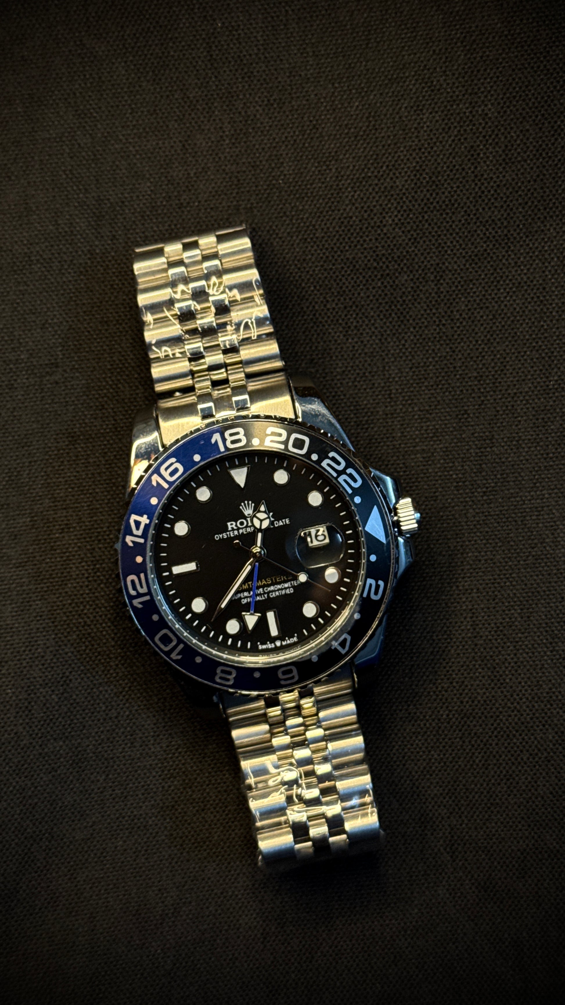 “Dive into the world of horological sophistication with the "GMT Maverick GMT Master ll - a premium watch inspired by the iconic Rolex GMT-Master II. This timepiece blends bold design with functional elegance, perfect for the modern adventurer . With its striking blue and black bezel and luminous dial markers, this watch commands attention while keeping pace with your global lifestyle
